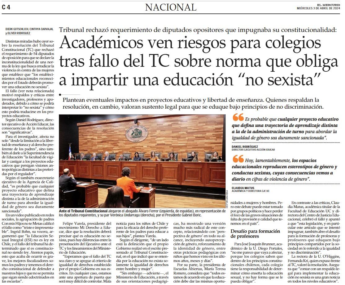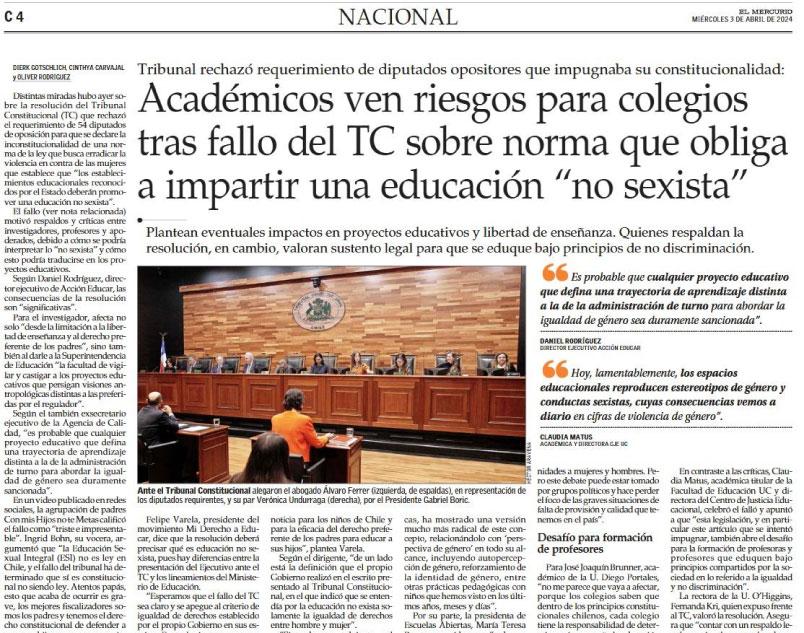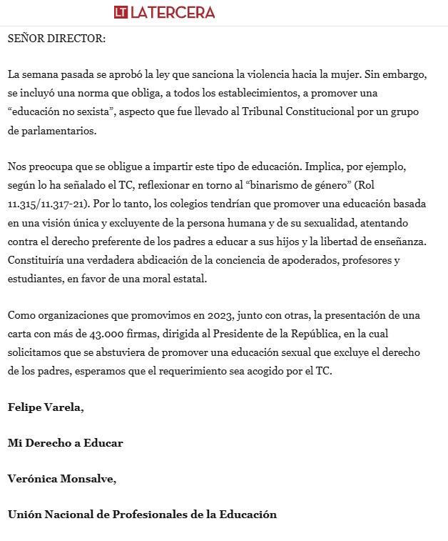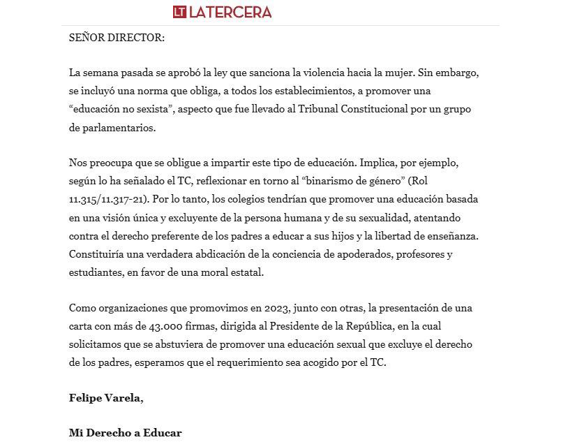 ‘Como organizaciones que promovimos en 2023, junto con otras, la presentación de una carta con más de 43.000 firmas, dirigida al Presidente de la República, en la cual solicitamos que se abstuviera de promover una educación sexual que excluye el derecho de los padres, esperamos que el requerimiento sea acogido por el TC’