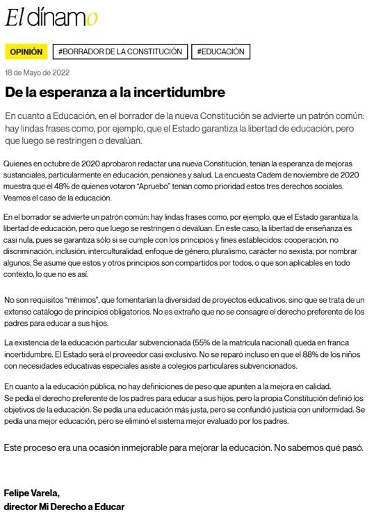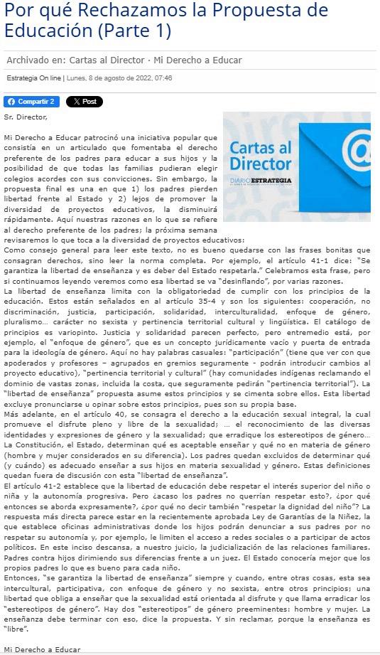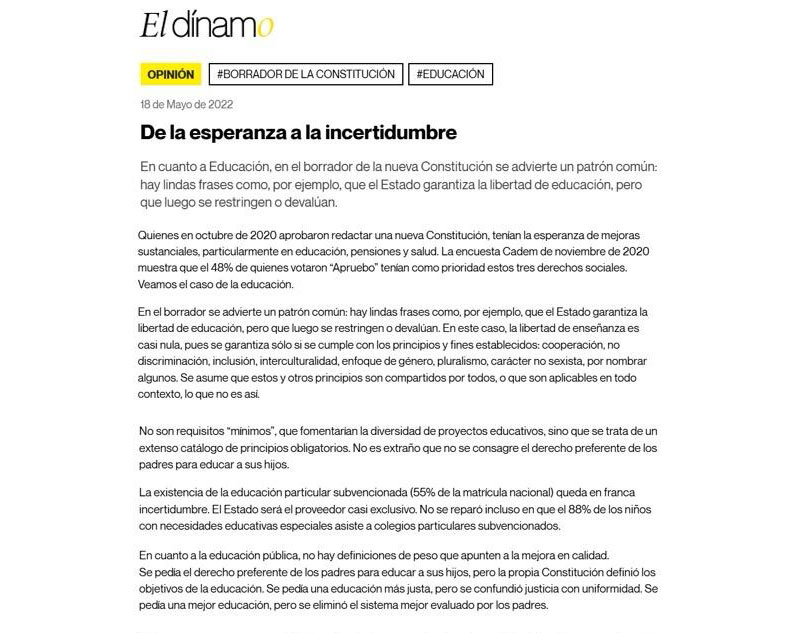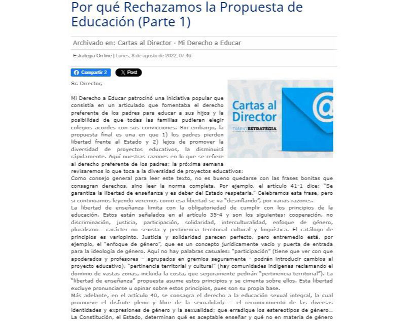 ‘Esperamos que el fallo del TC sea claro y se apegue al criterio de igualdad de derechos establecido por el propio Gobierno en sus escritos. En cualquier caso, estamos ante una apertura de puerta que será muy difícil de controlar. Mala noticia para los niños de Chile y para la eficacia del derecho preferente de los padres para educar a sus hijos’